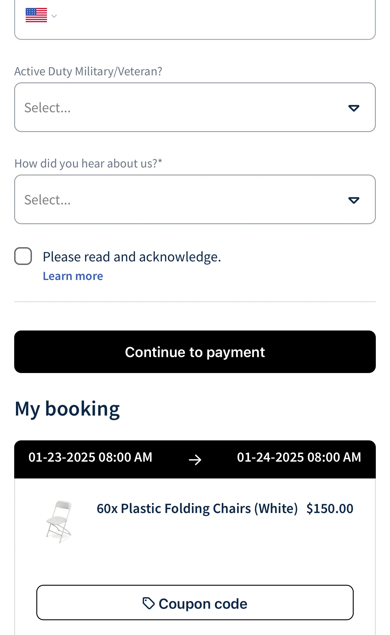 Fill in all required information and ensure the event location address is entered correctly. Upon reading the terms of agreement, check the box to acknowledge. If you have a coupon code to enter this is where you will do so by scrolling down past “Continue to Payment” until you see “Coupon Code”. You will also see your total and the amount due to confirm your reservation.